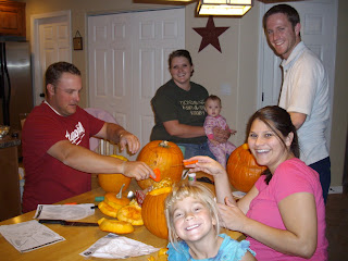 Luke, Ashlee Elster holding her baby Irelyn, Jeff, Gina, and Gina's little sister Tori. Gina and I work at the hospital together and Ashlee is married to Luke's good friend Rob who was home sleeping so he could go to work at 11. We also had lots of fun eating candy (my contribution) and Ashlee's yummy pumpkin chocolate chip cookies. thanks Ash!